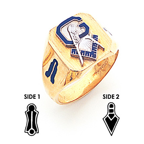 Solid back, polished 14k yellow gold ring with Masonic compass and set square symbol. Wide tapered blank sides with blue enamel emblems. Also available in white gold by special order.