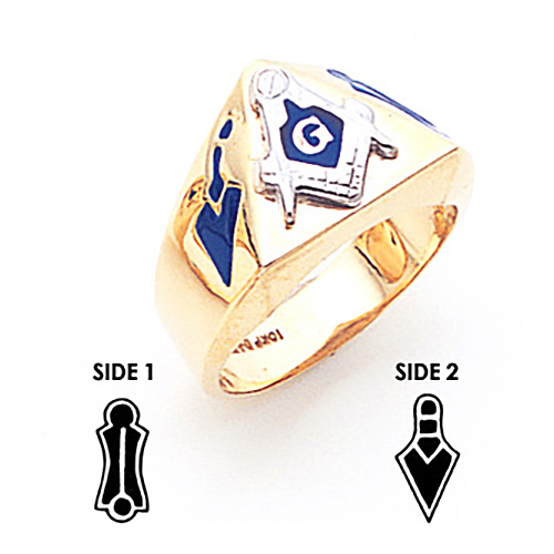 Open back, polished 10k yellow gold ring. 10k white gold Masonic compass and set square symbol. Triangular smoth top. Tapered shank with side emblems. Also available in white gold by special order.