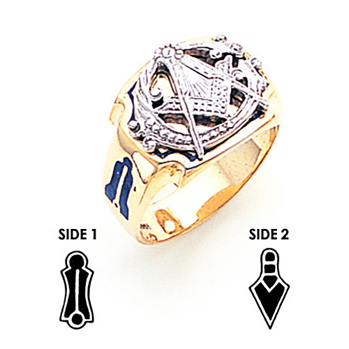 Solid back, polished 14kt yellow gold masonic ring has indented corners. Jumbo 14ky white gold Masonic compass and set square symbol. Tapered shank with blue enamel side emblems. Top dimensions: 13mm x 24mm. Also available in white gold by special order.