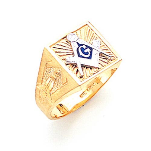 Choose open or solid back, polished 14k yellow gold ring with Masonic compass and set square symbol. Square sunburst top. Tapered shank with side emblems. Also available in white gold by special order. Made in USA.