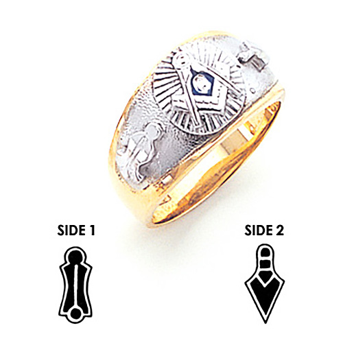 Concave back, polished 14kt yellow gold ring. 14k white gold Masonic compass and set square symbol. Tapered shank with side emblems.