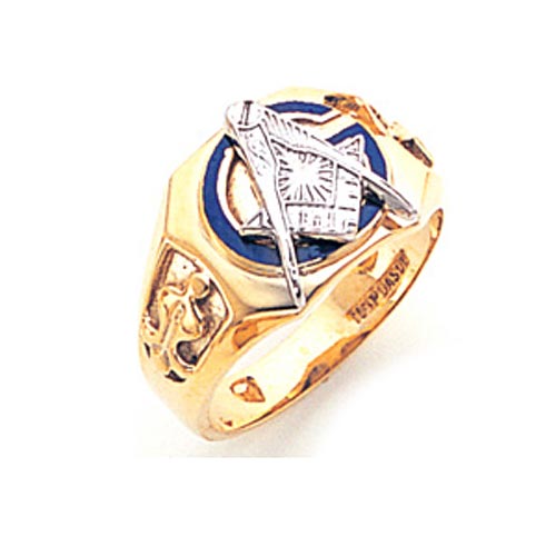 Concave back, polished 10k yellow gold ring has a masonic compass and set square symbol. Tapered shank with recessed side emblems. Also available in white gold by special order. Standard fit. Made in USA