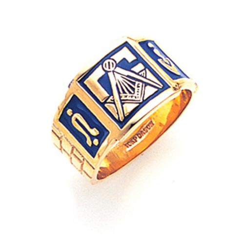 Solid back 10k yellow gold masonic ring features three blue enameled panels. 1/2 inch in width. 10k yellow gold Masonic compass and set square symbol. Wide shank with blue enamel side emblems. Plumb bob and trowel. Standard fit. Made in USA.