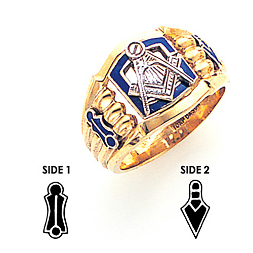 Open back, polished 14k yellow gold ring. 14k white gold Masonic compass and set square symbol. Blue enamel top with oversize G. Wide ribbed shank with blue enamel side emblems. Also available in white gold by special order.