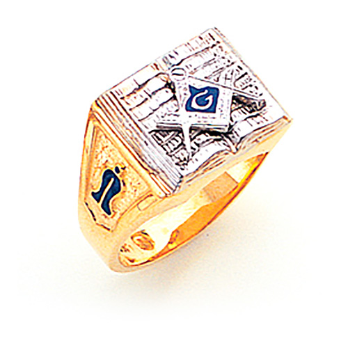 Solid back, polished 14k yellow ring has an open book on top. 14k white gold Masonic compass and set square symbol. Tapered shank with blue enamel side emblems. Standard fit. Made in USA.