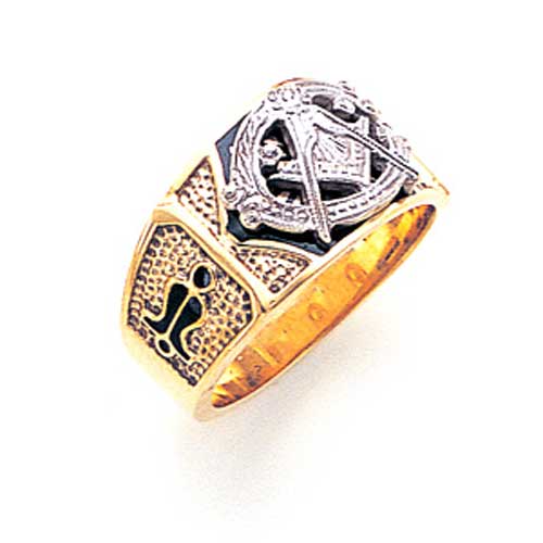 Solid back, polished 10k yellow gold masonic ring has a pebble grain shank with blue enamel side emblems. 10kt white gold Masonic compass and set square symbol. The top dimensions of this ring are 1/2 inch tall and 5/8 inch wide. Size 10 approximate weight: 10.9 grams. Also available in white gold by special order. Standard fi. Made in the USA.