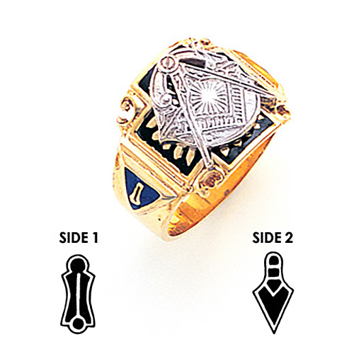 Solid back, polished 10kt yellow gold ring. 10kt white gold Masonic compass and set square symbol. Wide shank with blue enamel side emblems. Also available in white gold by special order.