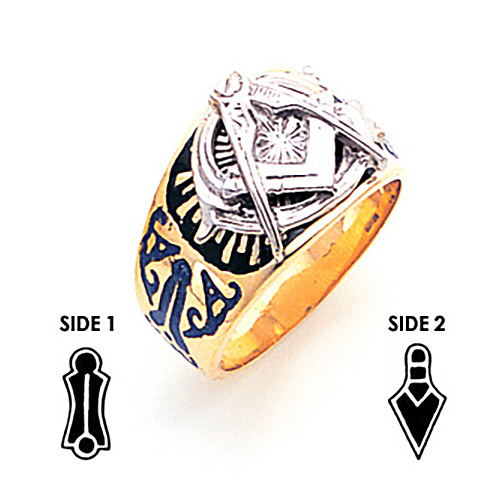 Solid back, polished 10k yellow gold ring. 10k white gold Masonic compass and set square symbol. Smooth tapered shank with black enamel side emblems. Top dimensions: 13mm x 22mm. Also available in white gold by special order.