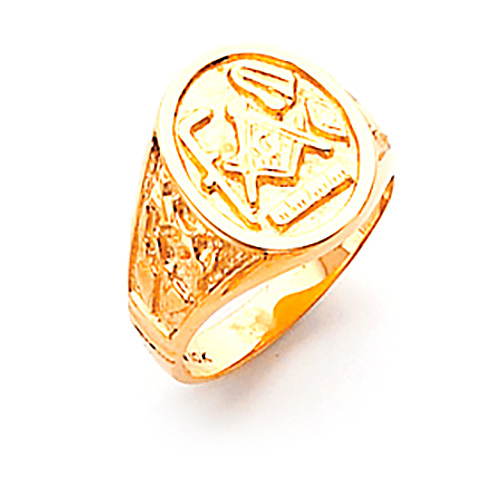 Solid back 14kt yellow gold masonic ring has an oval top with working tools design. Tapered shank with side emblems: plumb bob and trowel. No enamel nor antiquing. Bezel size: 14x12mm. Size 10 ring weighs approximately 10.9 grams. Also available in white gold by special order. Made in the USA.