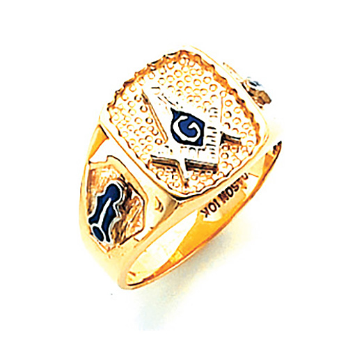 Solid back, polished 10kt yellow gold ring. 10k white gold Masonic compass and set square symbol. Signet style top. Tapered shank with blue enamel side emblems.