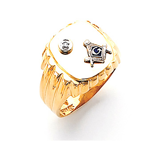 This solid 10k yellow gold masonic ring has a diamond accent and tiny G, square and compasses emblem. Ring features 1 x .03CT full-cut, bezel set diamond. Smooth oblong top. Tapered grooved shank. Choose open or solid back. Standard fit. Made in USA.