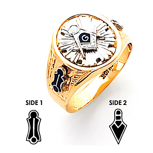 Harvey & Otis 10k two-tone gold masonic ring has a round starburst top. 10k white gold Masonic compass and set square symbol. Tapered shank with blue enamel side emblems. Standard fit. Made in USA.