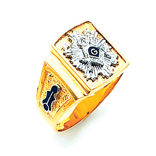 Solid back, polished 10kt yellow gold ring with Masonic compass and set square symbol. Wide shank is pictured with blue enamel side emblems: Eye and Trowel. Choose any two side emblems. Top dimensions: 15mm x 22 mm.