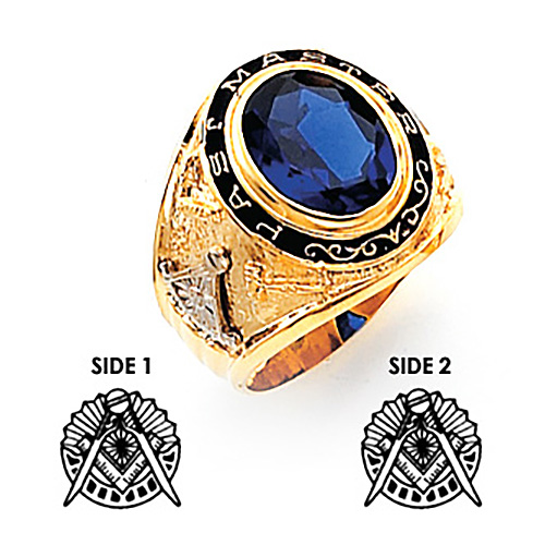 Polished 14kt yellow gold masonic ring has an oval blue stone with bezel spellout: PAST MASTER. Wide tapered shank with Masonic compass and set square side emblems. Solid back ring average weight: 18.6 grams. Open back ring weight: 12.0 grams. Choose solid or open back. Made in the USA.