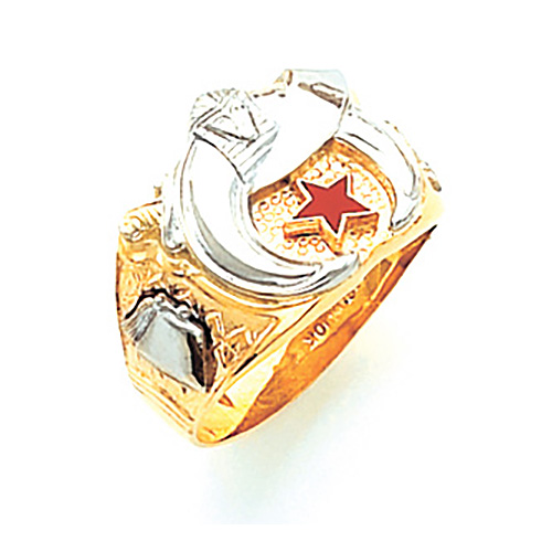 Choose open or solid back, polished 14k yellow gold ring. 14kt white gold Shriners insignia with red enamel star. Wide tapered shank with 10k white gold Fez and Camel side emblems. Standard fit. Made in USA.