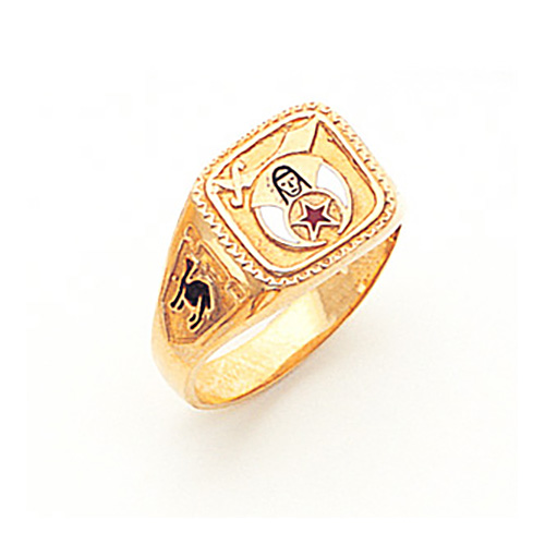 Solid back, polished 10kt yellow gold ring. Full color Shriners insignia. Wide tapered shank with black enamel Fez and Camel side emblems.