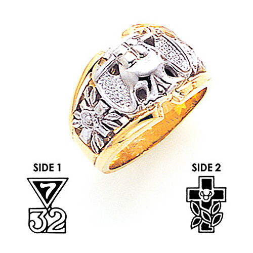 This jumbo Scottish Rite ring is made of 14k yellow gold. Solid back. Wide shank has oversize cut-out 40k white gold side emblems with yod character, 32 and cross. The 14k white gold double-headed eagle symbol is for the Ancient and Accepted Scottish Rite of Freemasonry. Made in USA.