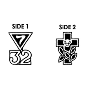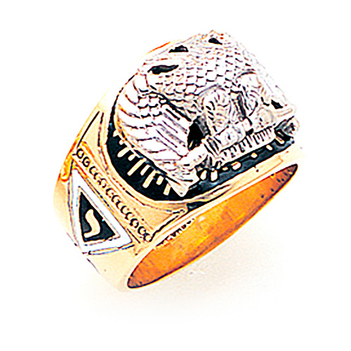 Best seller! Solid back, polished 10k yellow gold Scottish Rite ring. The 10k white gold double-headed eagle symbol is for the Ancient and Accepted Scottish Rite of Freemasonry. Ring top width: 16mm. Wide tapered shank features black and white enamel side emblems with triangle, yod character and 32. The number 32 represents the 32nd degree of the Scottish Rite. Standard fit. Average ring weight: 15.3 grams. Made in USA.