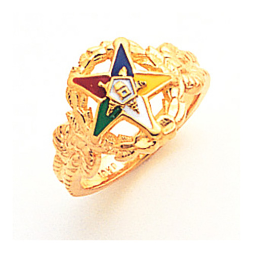 This slender eastern star ring is made of polished 10kt yellow gold and has an open top. Five-color enamel Order of the Eastern Star logo. Standard fit. Made in USA.