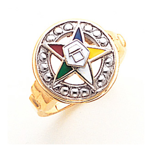 Polished 14k yellow gold. Round top. Finely detailed ring features enamel Order of the Eastern Star logo.