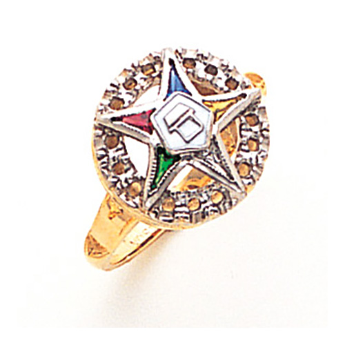 14k yellow gold Eastern Star ring has a round 14k white gold top. Finely detailed ring features enamel Order of the Eastern Star logo. Standard fit. Made in USA.