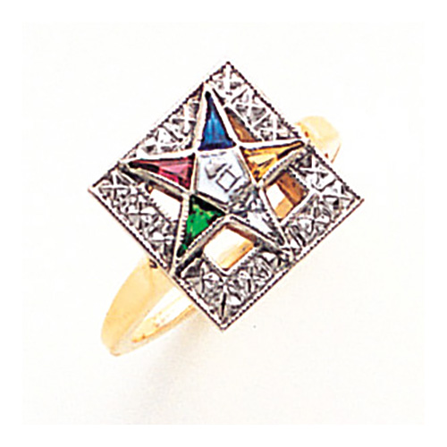 Polished 10k yellow gold. Square 10k white gold top. Finely detailed ring features enamel Order of the Eastern Star logo.