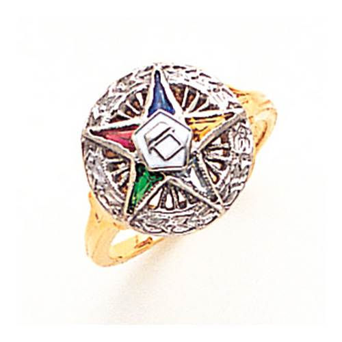 14k two-tone gold Order of the Eastern Star ring has a fancy round top. This ring features the five pointed star multi-colored OES logo. Standard fit. Made in USA.