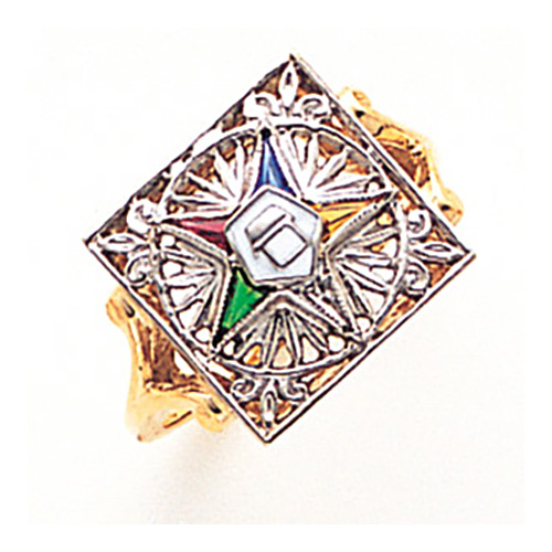 14k yellow gold order of the eastern star ring has a square 14k white gold top. Finely detailed ring features enamel Order of the Eastern Star logo. Standard fit. Made in USA.