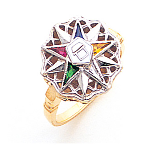 Order of the Eastern Star ring has a sunburst top and is made of 10k yellow and white gold. Standard fit ring features enamel Order of the Eastern Star logo. Slender shank. Made in USA.