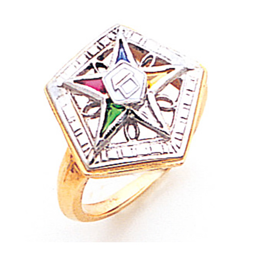 Polished 10k yellow gold. Pentagon 10k white gold top. Finely detailed ring features enamel Order of the Eastern Star logo.