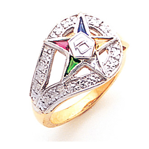 Order of the Eastern Star ring has an eye-shaped frame and is made of polished 14k yellow gold. Finely detailed ring features multi-colored Order of the Eastern Star logo. Standard fit. Made in USA.