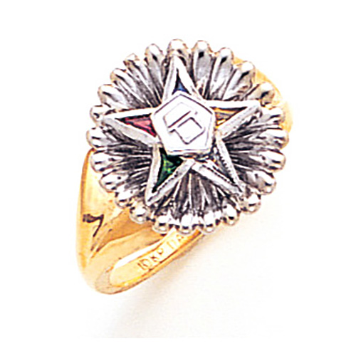 10k yellow gold Order of the Eastern Star ring has a 10k white gold cluster top. Multi-colored Order of the Eastern Star logo in the center. This ring is standard fit and has a tapered shank. Made in USA.