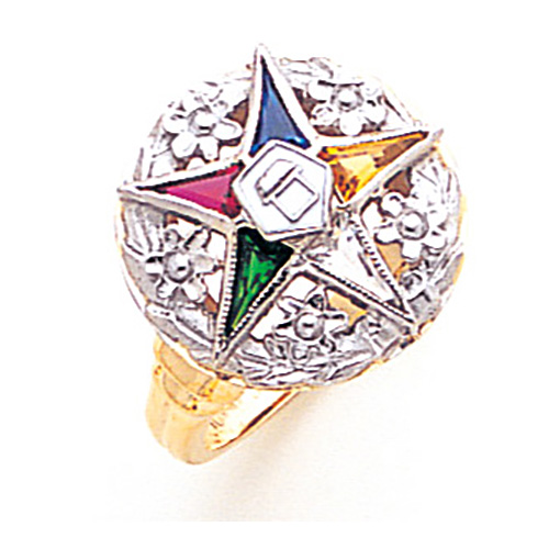 10k two-tone gold Order of the Eastern Star ring is decorated with five flowers on top. Multi-colored Order of the Eastern Star logo. 10k yellow gold shank and 10k white gold top. Standard fit. Made in USA.