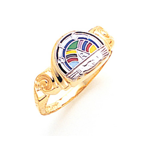 Rainbow girl ring has a scroll design shank and is made of 14k yellow gold. Rainbow enamel top. Open back. Rainbow is a non-profit, service-oriented organization that teaches girls three basic virtues: Faith in a Supreme Being and other people, having Hope in all that they do, and Charity toward others.
