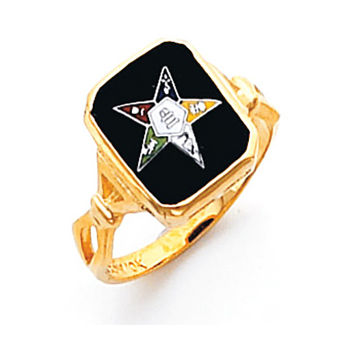 10k yellow gold Order of the Eastern Star ring has a rectangular black onyx stone and geometric shank. Multi-colored enamel Order of the Eastern Star logo on stone. Standard fit. Made in USA.