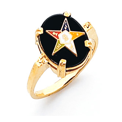 14k yellow gold Order of the Eastern Star ring is set with an oval black onyx in four prongs. Finely detailed ring features enamel Order of the Eastern Star logo. Standard fit. Made in USA.