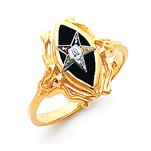 Polished 14kt yellow gold eastern star ring has a black onyx marquise stone with logo. Open back and standard fit. Made in USA.
