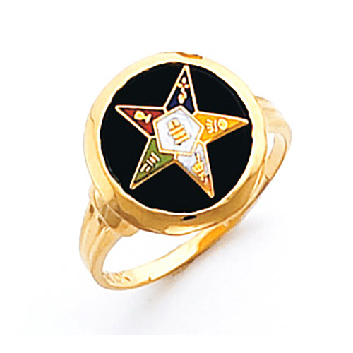 Polished 14k yellow gold eastern star ring has a black onyx round stone with logo. Open back and standard fit. Made in USA.