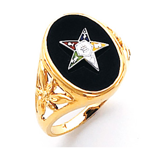 Eastern star ring is made of polished solid 14k yellow gold. Oval black onyx. Finely detailed ring features enamel Order of the Eastern Star logo. Standard fit. Made in USA.