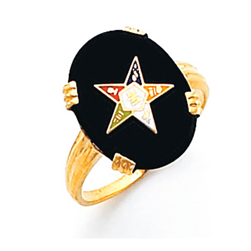 This 14k yellow gold Order of the Eastern Star ring has a large black oval onyx. Stone size: 15mm x 10mm. Four prongs. Enamel OES logo. Standard fit. Made in USA.
