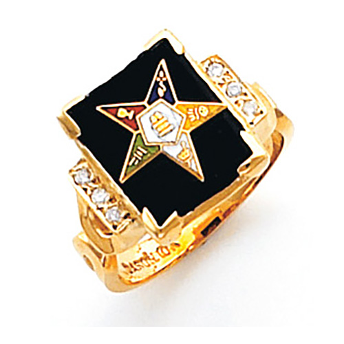 Polished 14kt yellow gold Order of the Eastern Star ring has diamond accents. Rectangular black onyx top. 6 x .01CT full-cut round diamonds. Finely detailed ring features enamel Order of the Eastern Star logo.