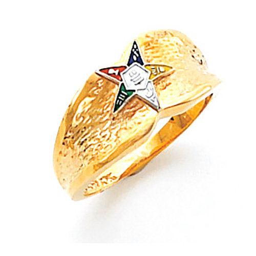 Concave ring features a small enameled Order of the Eastern Star logo and is made of polished 10kt yellow gold. Standard fit. Made in USA.