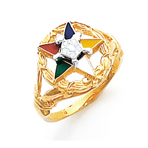 14kt yellow gold Order of the Eastern Star ring has a wreath top. Ring features enamel Order of the Eastern Star logo. Ring top width: 11/16in, the size of a dime. Standard fit. Made in the USA.