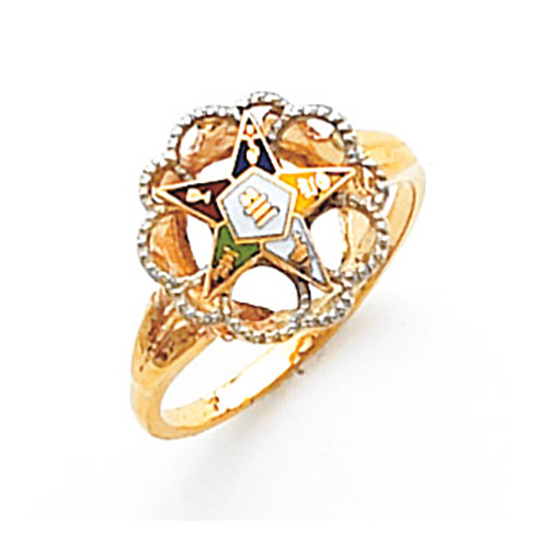 Order of the Eastern Star ring features a 14k white gold top with scalloped edges. Polished 14k yellow gold shank. Enameled OES logo sits in the middle. Standard fit. Made in USA.