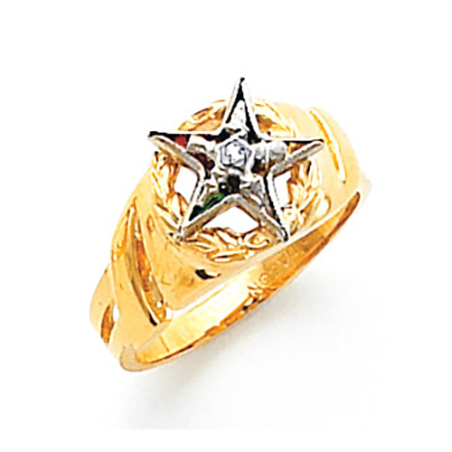 Polished 14k yellow gold. 14k white gold laurel wreath cut-out top, grooved shank. Ring features enamel Order of the Eastern Star logo.