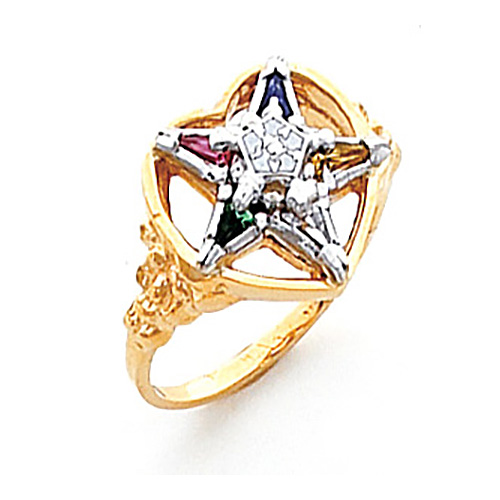 Polished 14k yellow gold. Heart-shaped top encloses 14k white gold star. Finely detailed ring features enamel Order of the Eastern Star logo.