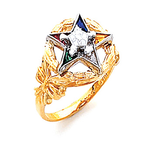 Polished 10kt yellow gold. 10kt white gold top. Ornate ring features enamel Order of the Eastern Star logo.