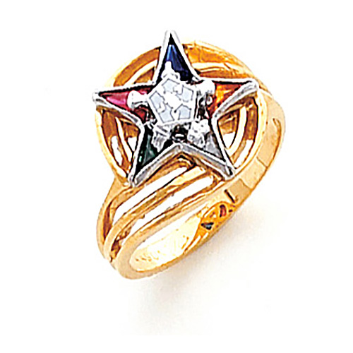 14k yellow gold order of the Eastern star ring has a bypass design. Cut-out shank and top. Ring features enamel Order of the Eastern Star logo. Standard fit. Made in USA.