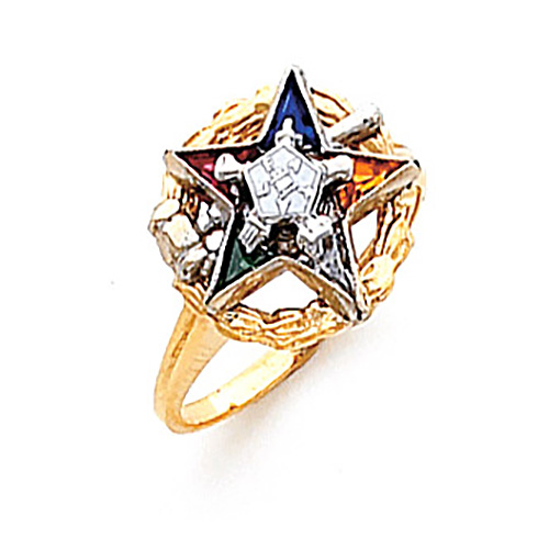 Past matron eastern star ring is made of polished 10kt yellow gold. 10kt white gold top with gavel. Finely detailed ring features enamel Order of the Eastern Star logo.