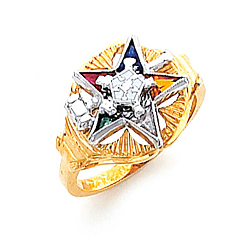 Polished 10k yellow gold. 10k white gold clover design top. Finely detailed ring features enamel Order of the Eastern Star logo.